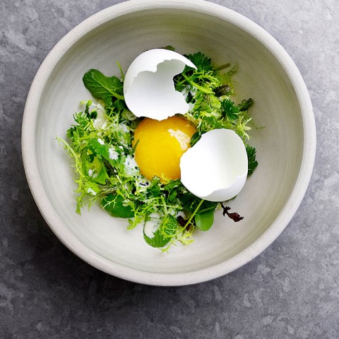 Norway lobster head filled with langoustine tartare, smoked cheese and freeze-dried lobster served with asparagus and warm vinaigrette