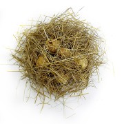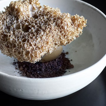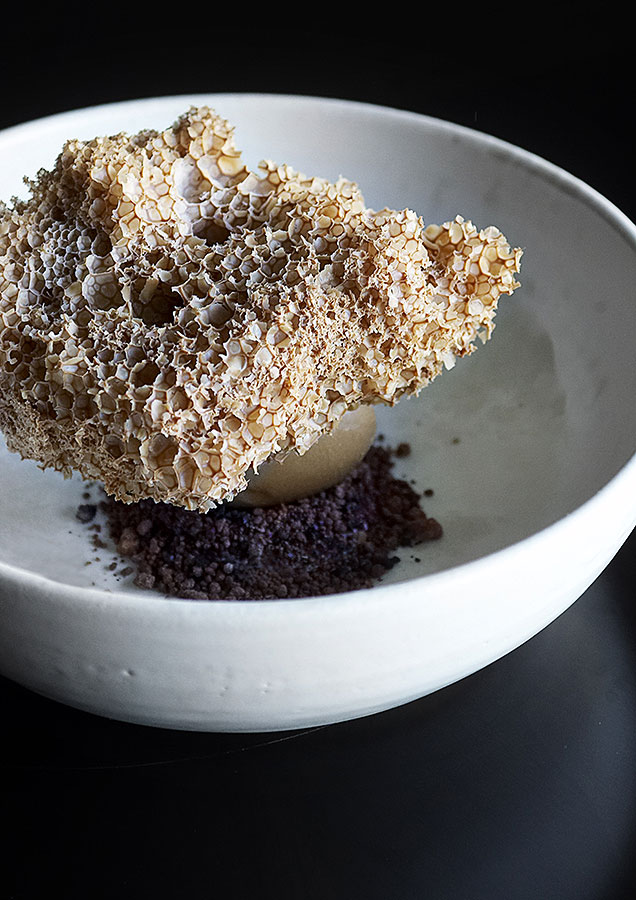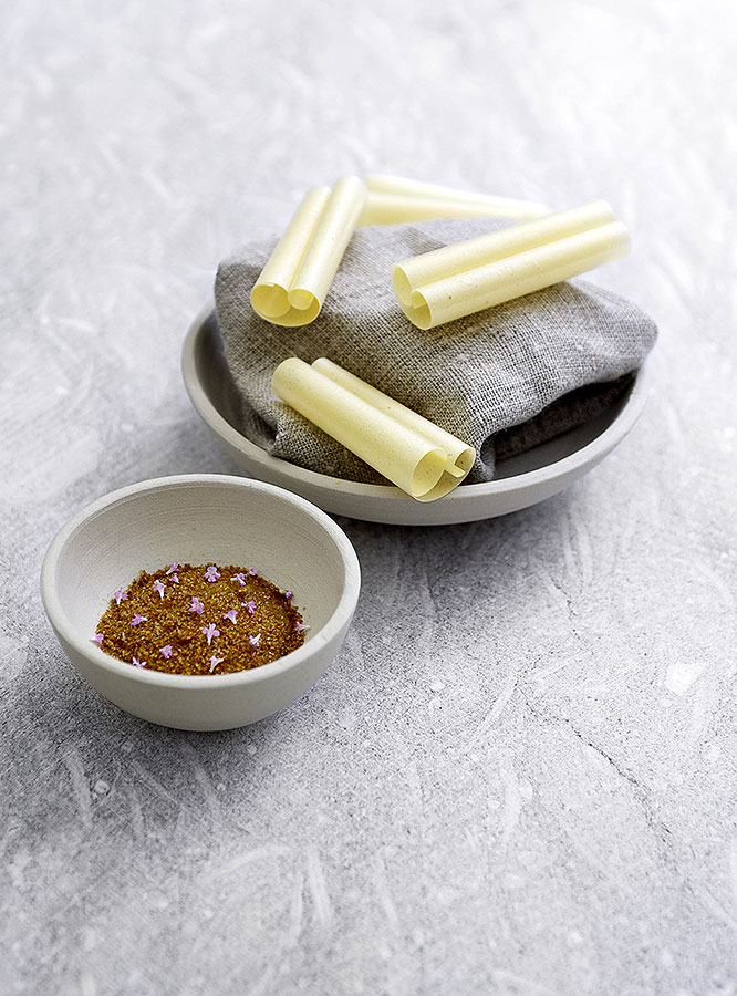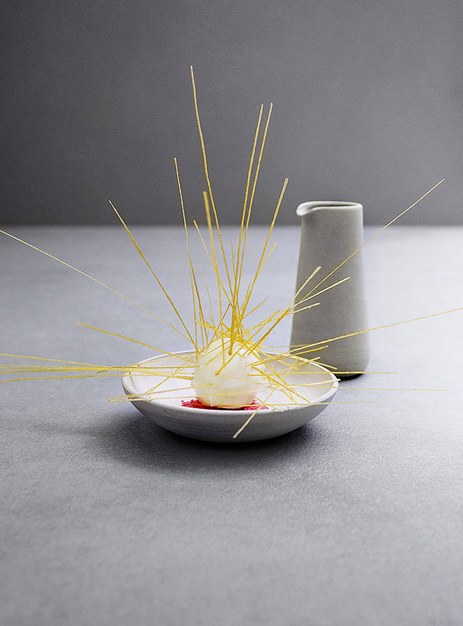 Hay sorbet from toasted hay, hay cream and freeze-dried strawberry