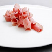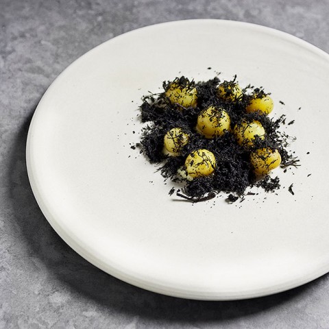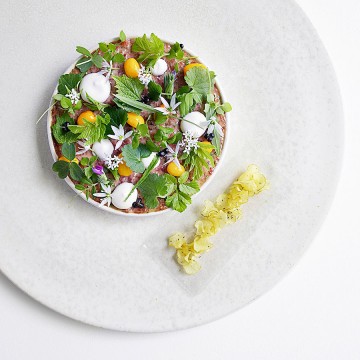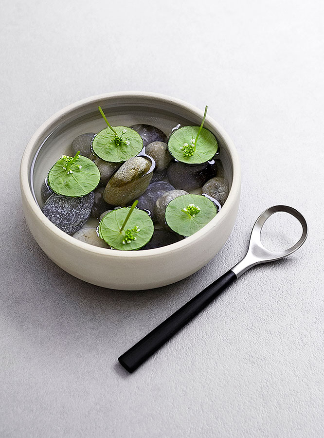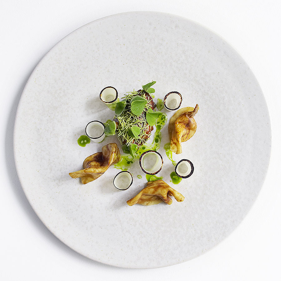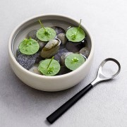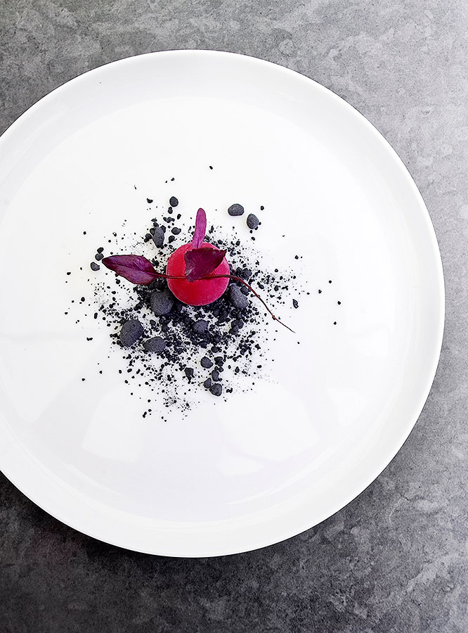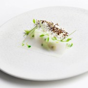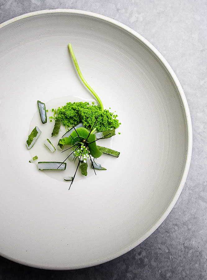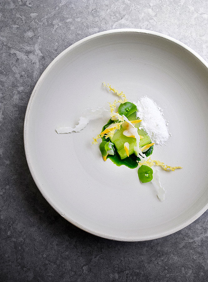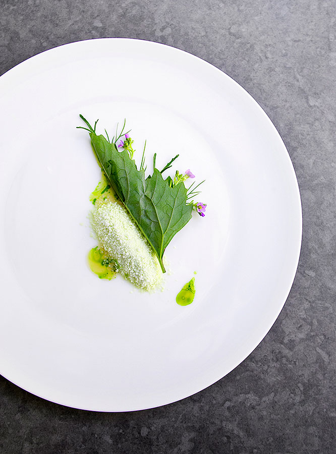 Salted razor clams with green strawberries, pickled radish and horseradish snow